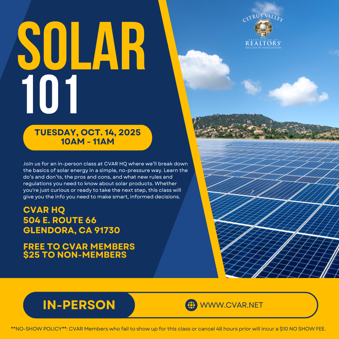 Learn the basics of solar energy and what every REALTOR® should know. Explore the do’s and don’ts, the benefits and challenges, and stay up to date on the latest rules and regulations for solar products. This in-person class will be held at CVAR HQ.