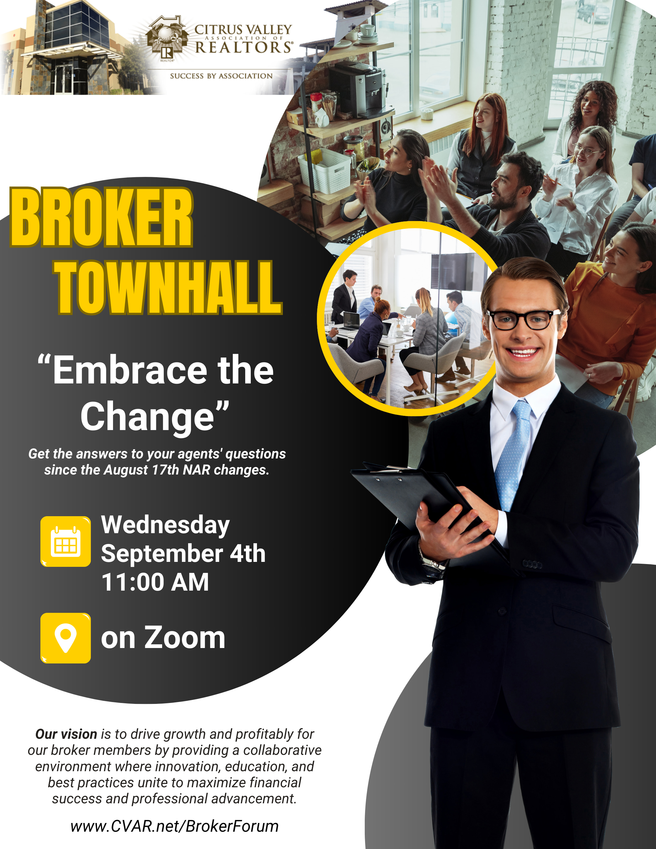 The next Broker Townhall is on Wednesday, September 4th from 11am-12pm. In this session we will meet with CVAR's brokers and office managers for a mastermind meeting featuring the topic of :Embracing The Change" and learn how to navigate situations you may face from the changes to CRMLS and the CAR Forms. Join us for this session to better understand your business and help your agents succeed. See you then!