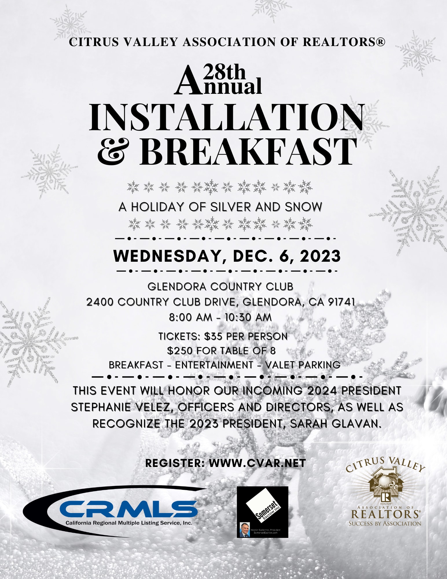 Citrus Valley Association of REALTORS is hosting it's 28th Annual Installation of the 2024 CVAR President and Board of Directors. This event will honor our incoming 2024 President, Stephanie Velez and 2023 President Sarah Glavan as well as our 2024 Board of Directors and leadership team. Join us at Glendora Country Club for breakfast, entertainment, special guests, raffles, & more.