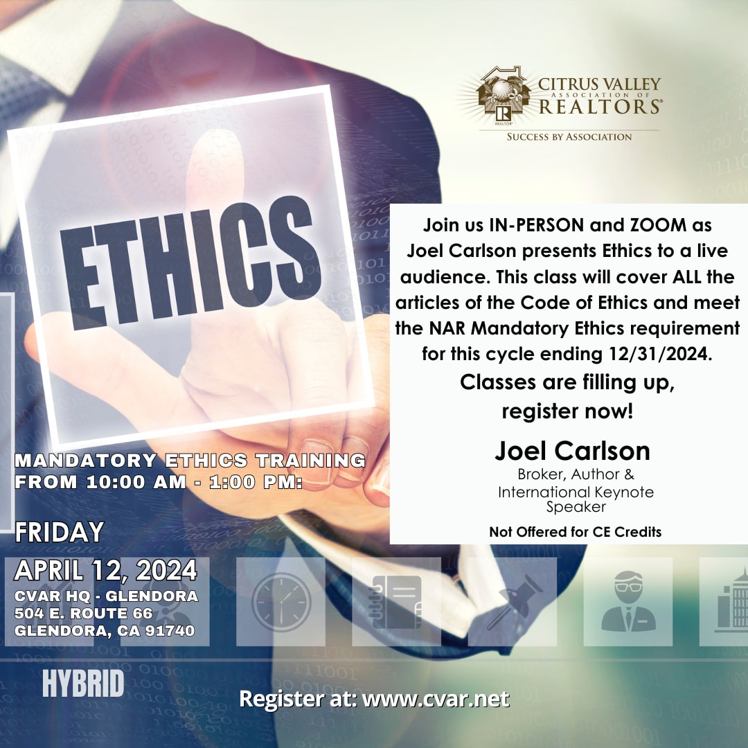 Join us on Zoom for an Ethics Replay featuring Joel Carlson.  This class will cover ALL the articles of the Code of Ethics and meets the NAR Mandatory Ethics requirement for this cycle ending 12/31/2024. Not Offered for CE Credits.