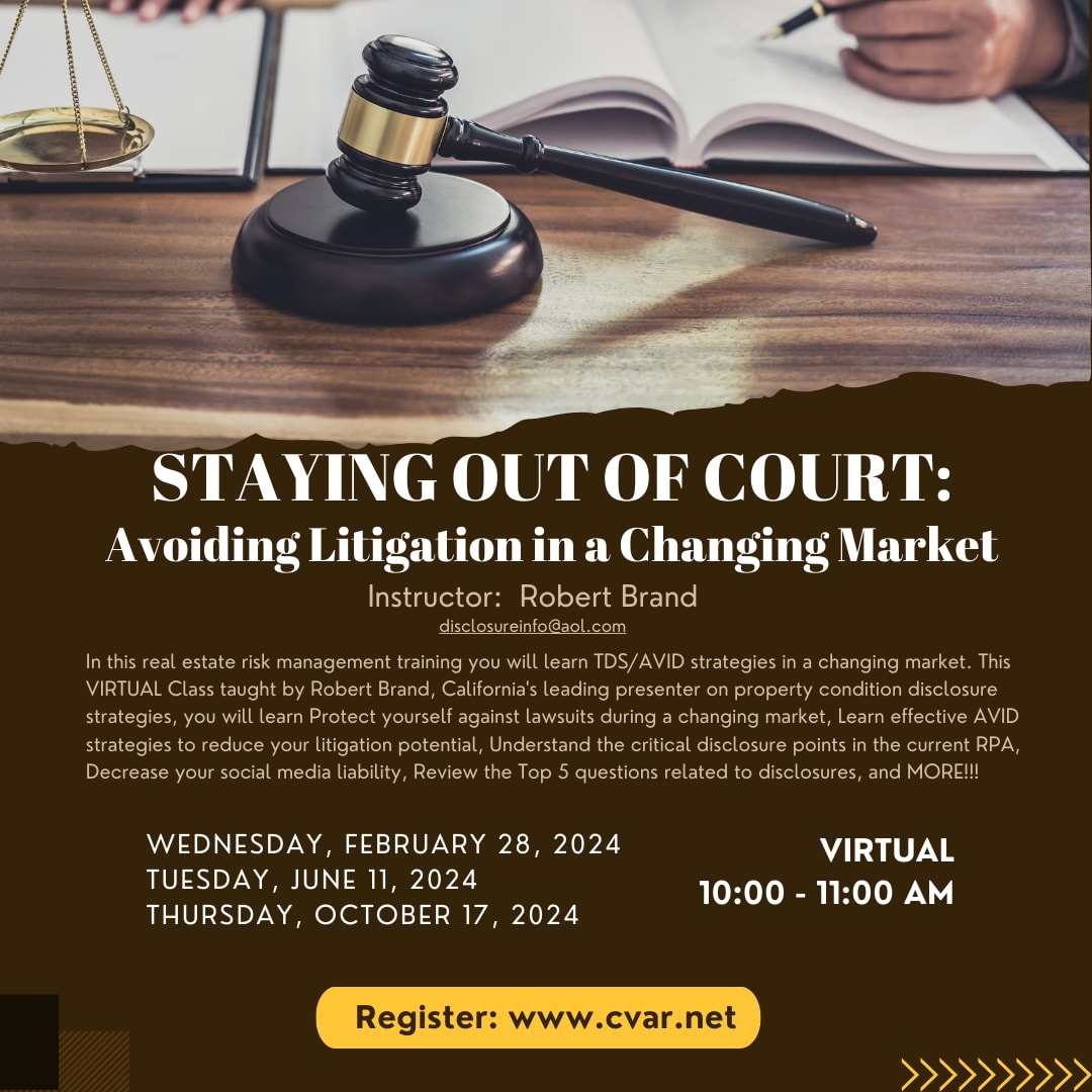 In this real estate risk management training you will learn TDS/AVID strategies in a changing market. This VIRTUAL Class taught by Robert Brand, California's leading presenter on property condition disclosure strategies, you will learn Protect yourself against lawsuits during a changing market, Learn effective AVID strategies to reduce your litigation potential, Understand the critical disclosure points in the current RPA, Decrease your social media liability, Review the Top 5 questions related to disclosures, and MORE!!!