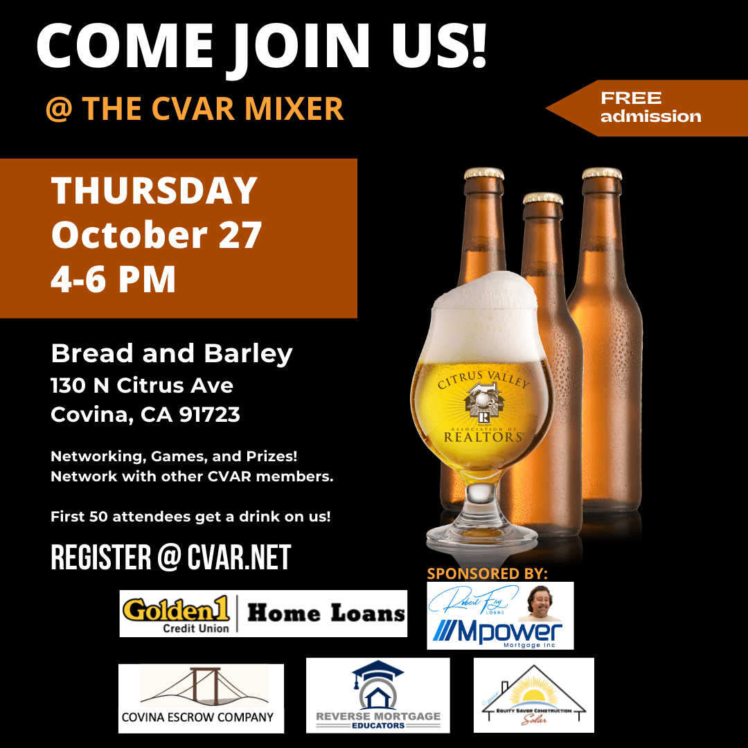 Networking, Games, and Prizes! Join us at Bread & Barley in Covina to enjoy a beverage, network with other CVAR members and affiliates, and possibly win some prizes. Contact Nancy Oakley at noakley@cvar.net for more information. See you there!